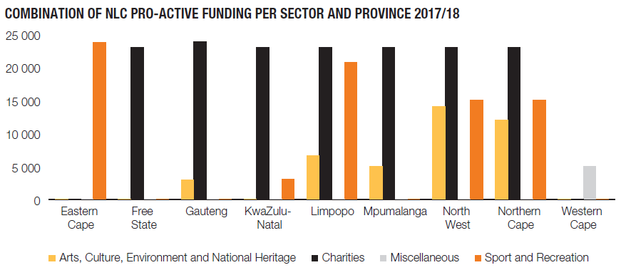 The Eastern Cape was allocated 10.7% of the total allocations made in FY2017-18 to the value of R159 million; the largest share went to Sport and Recreation (17%), followed by Arts, Culture and Heritage and Miscellaneous (9% each) and lastly Charities (7%). Over 400 public schools were granted funds to upgrade and improve their sporting infrastructure. The relatively small allocation to Charities can be attributed to the fact that many small grant applicants from the 2015 Charities call were still being processed; we expect to see increased uptake of Charities grants in the 2018-19 FY.