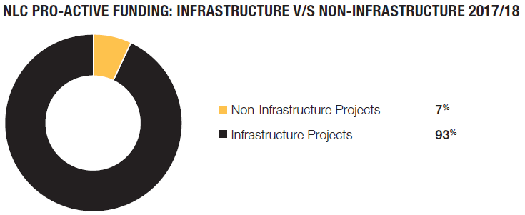 The NLC proactively funded 20 projects amounting to R284 872 798. The majority of projects funded under pro-active funding were in the Charities Sector at 57% followed by Sports at 27%, Arts and Miscellaneous at 14% and 2% respectively. Most of the funding under the Charities Sector was for the construction of Old Age Homes and a Drug Rehabilitation Center while most of the funding for the Sports Sector related to the construction of Multisport Facilities. Majority of funding for Arts Sector was for the construction of Library, Museum and Cultural Village while Miscellaneous funding was for the drilling of boreholes in areas affected by drought. The above charts further indicate that Limpopo, Northern Cape and North West collectively received 54% of the pro-active funding budget followed by Mpumalanga at 10%, Gauteng and KwaZulu-Natal at 9% each. The above charts shows the NLC commitment of funding high-impact projects with the limited funding at hand. From the total allocated budget for pro-active funding, 93% was spent on infrastructure project.