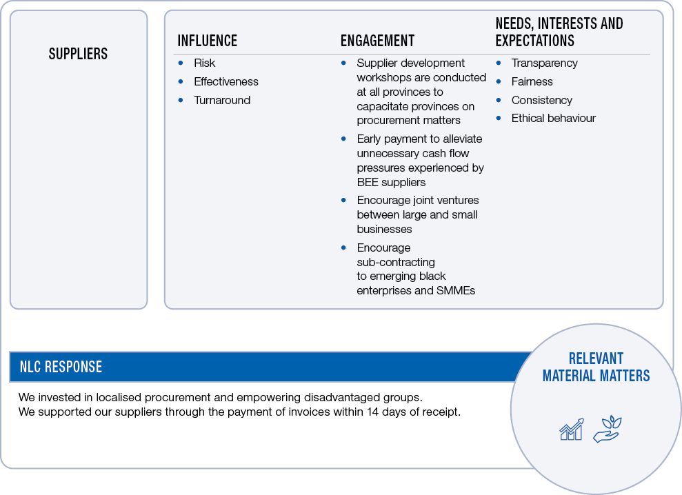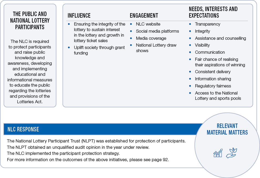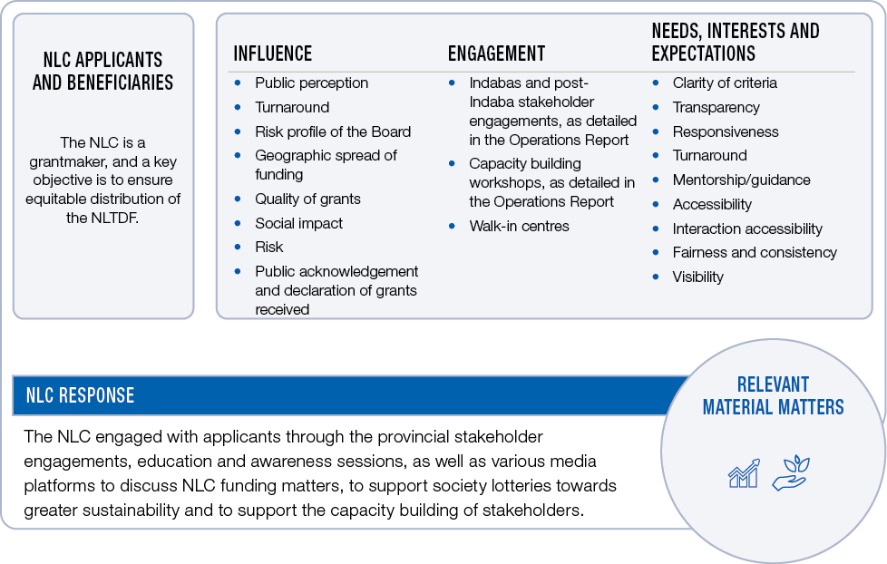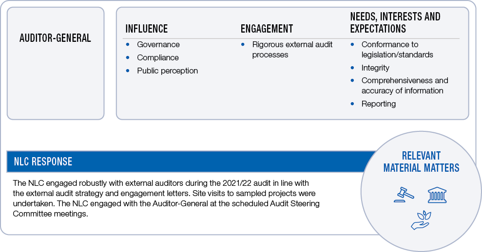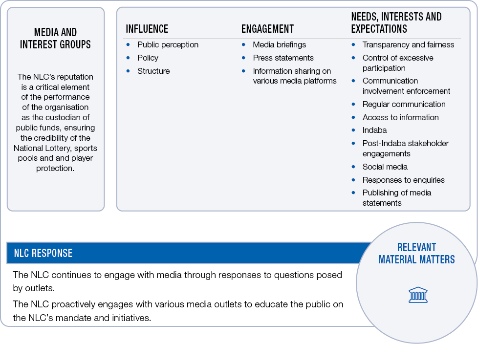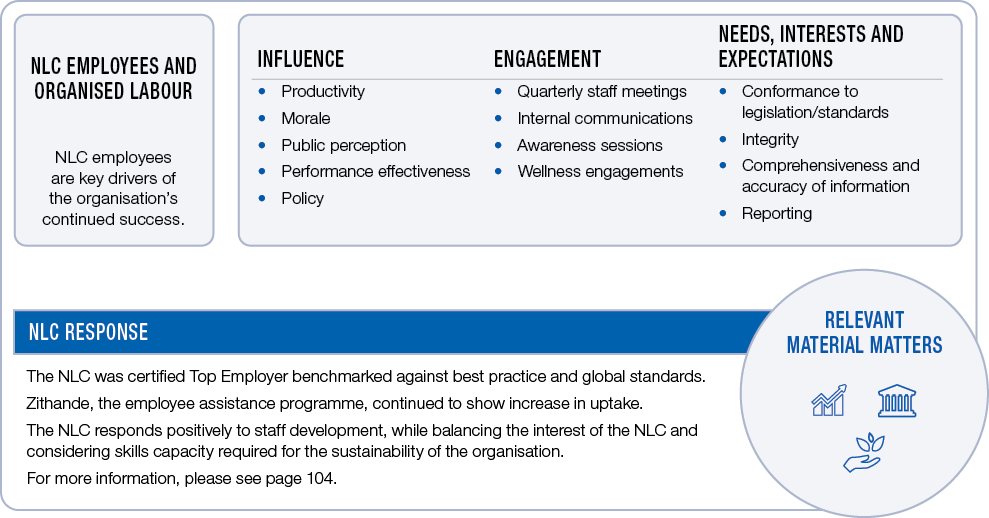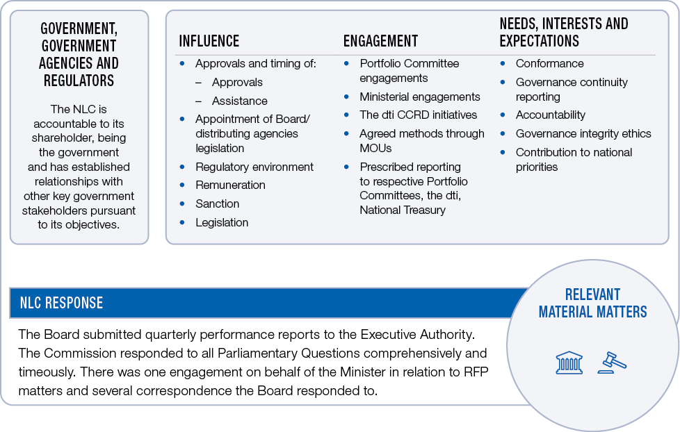 The NLC has a range of stakeholders who have influence over the NLC and its operations and/or over whom the NLC has influence. The table below covers the key stakeholders, explains their influence on the NLC or the influence over them, the means of NLC engagement, their legitimate needs, interests and expectations and how the NLC has responded to these.