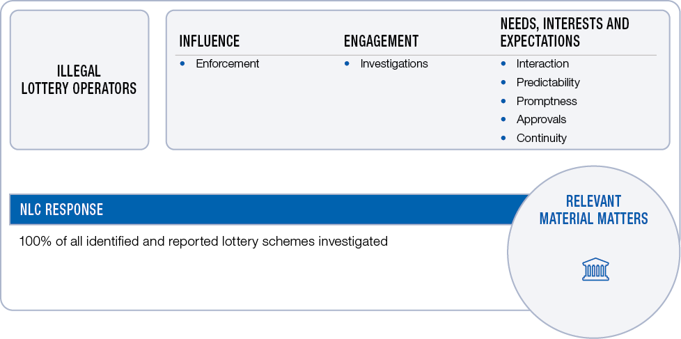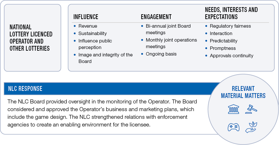 Key stakeholders of NLC’s regulatory function include lottery participants, lottery operators and other gaming regulators. The NLC strives to provide an enabling environment for licenced operators to conduct their affairs without a heavy regulatory burden to comply with.