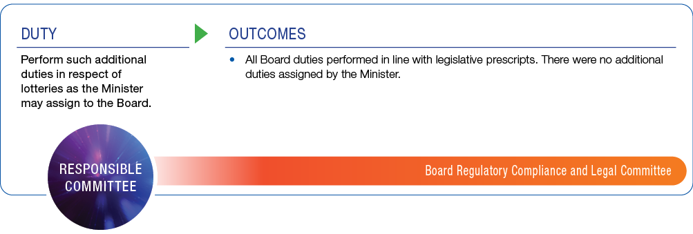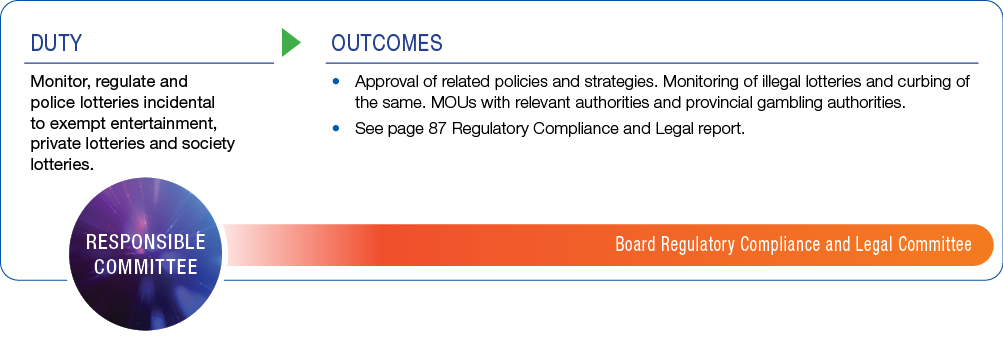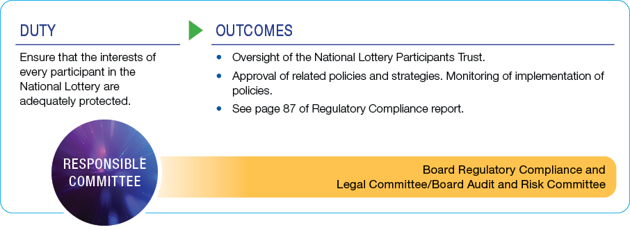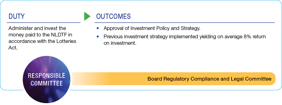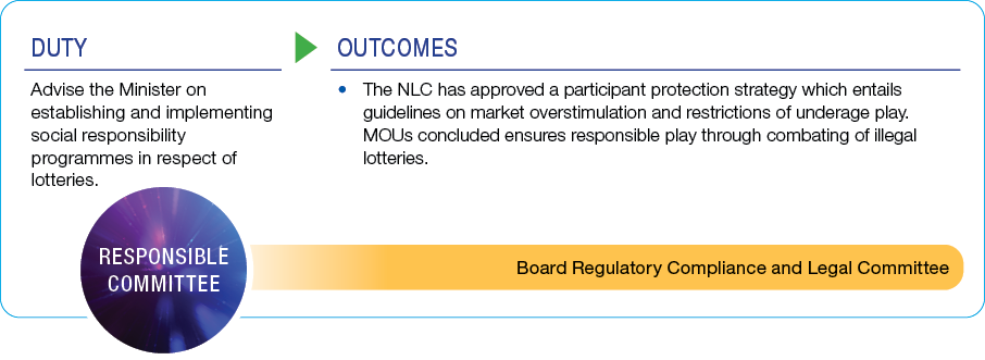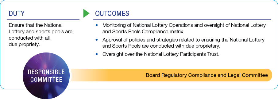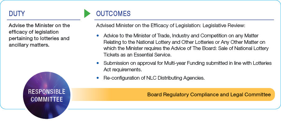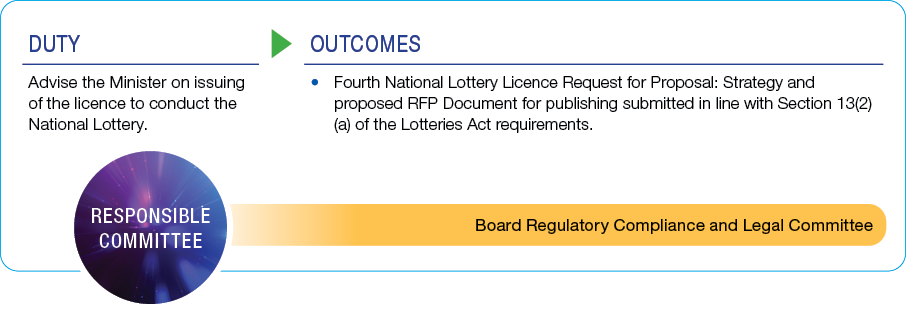 The Regulatory Compliance and Legal Committee is a Committee charged with the duty to ensure that the Board advises the Minister on issuing the licence to conduct the National Lottery as well as ensure that the National Lottery and sports pools are conducted with all due propriety and strictly in accordance with the Constitution, the Lotteries Act, all other applicable law and the licence for the National Lottery together with any agreement pertaining to that licence. The Committee is also expected to provide assurance to the Board that the NLC is fulfilling its primary regulatory mandate, that is to ensure that the interests of every participant in the National Lottery are adequately protected.