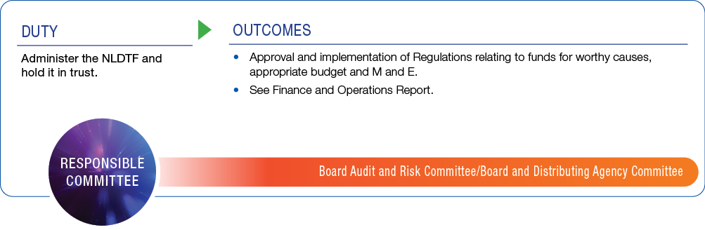 During their engagements the Committee reviewed its Charter and policy framework. The Committee’s oversight over the Operations Division and Distributing Agencies ensured NLC’s strategic objectives and related outcomes were achieved (icons refer to Operations Report, Performance Highlights). The Committee continues to ensure the efficient and effectively performance of the NLC through the Operations Division as well as ensure the fair and equitable distribution of funds through independent and objective adjudication.