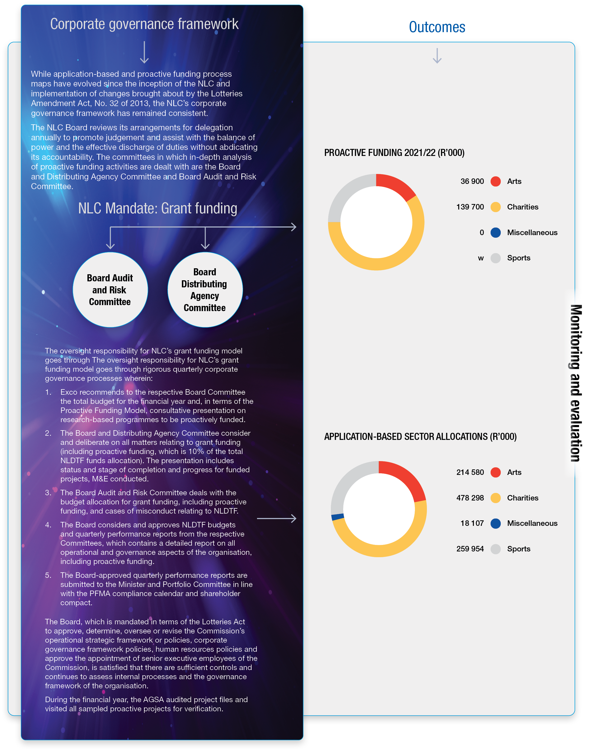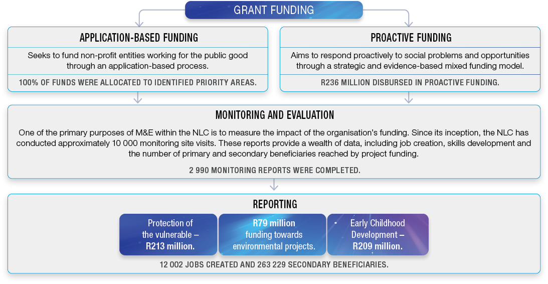 One of the strategies introduced to address the shortcomings in priority areas, in general, is the introduction of the funding model, which aims to respond to social problems and opportunities through a strategic and evidence-based mixed funding model. The amended legislation made provision for proactive funding (research-based funding), which can emanate from three sources: the Minister, the Board, or the Commission. The NLC has already successfully implemented several proactive funding projects.