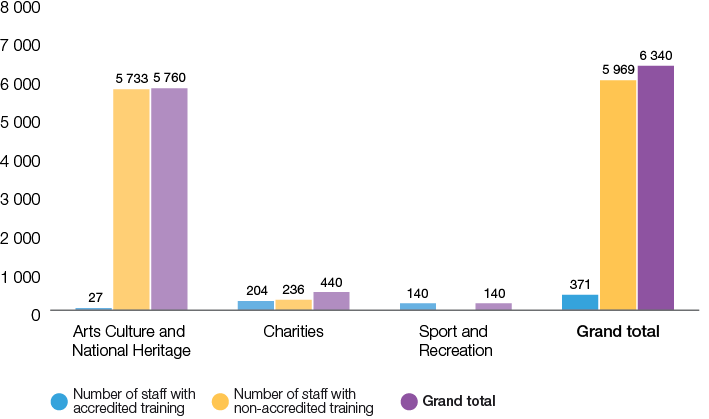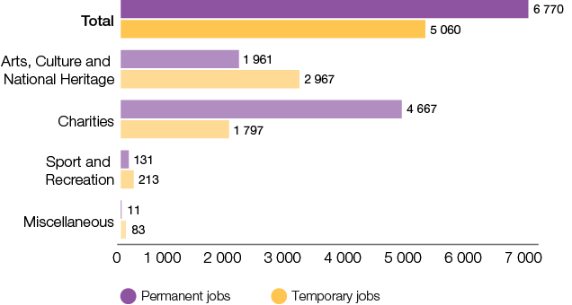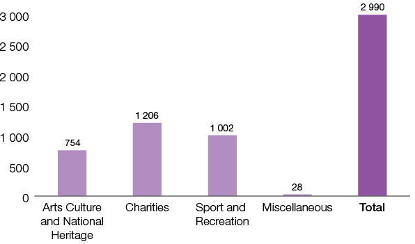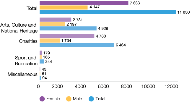 Graph below shows the distribution of job creation among the three sectors. More jobs were created under the Charities sector, followed by Arts, Culture and National Heritage and Sport and Recreation sectors. A total of 94 jobs were created in the miscellaneous sector. A total 7 683 jobs (64%) were created for women.
